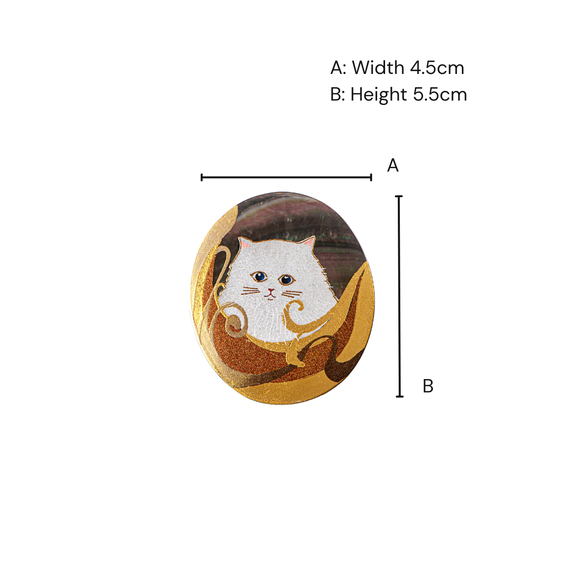 The gentle face of a white cat emerges with refined delicacy, captured in luminous detail by Modern Makie. Traditional Makie artistry meets modern techniques, creating new lacquer crafts with mother of South Sea Pearl.
