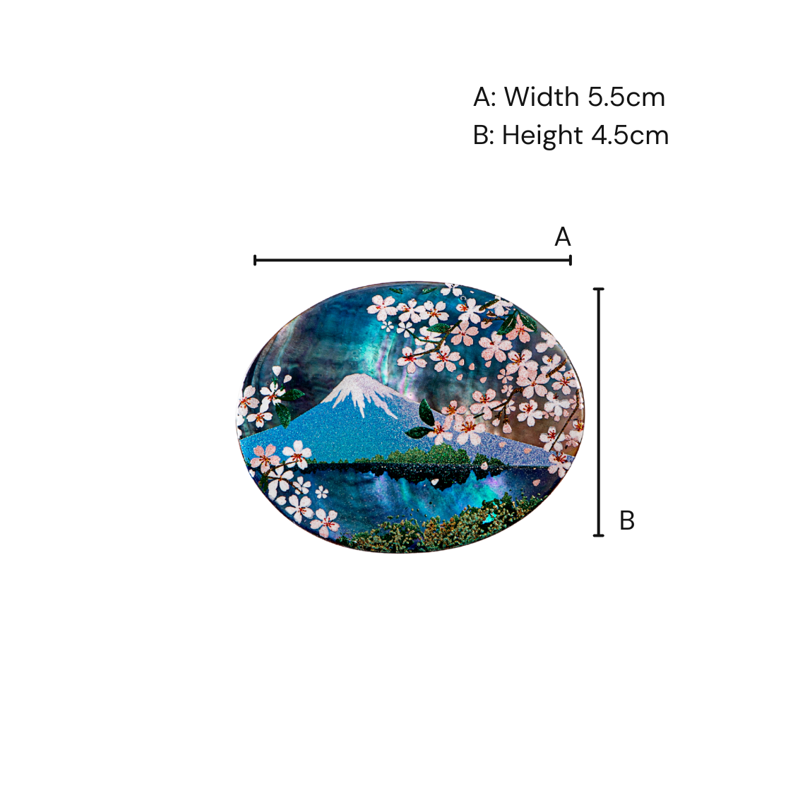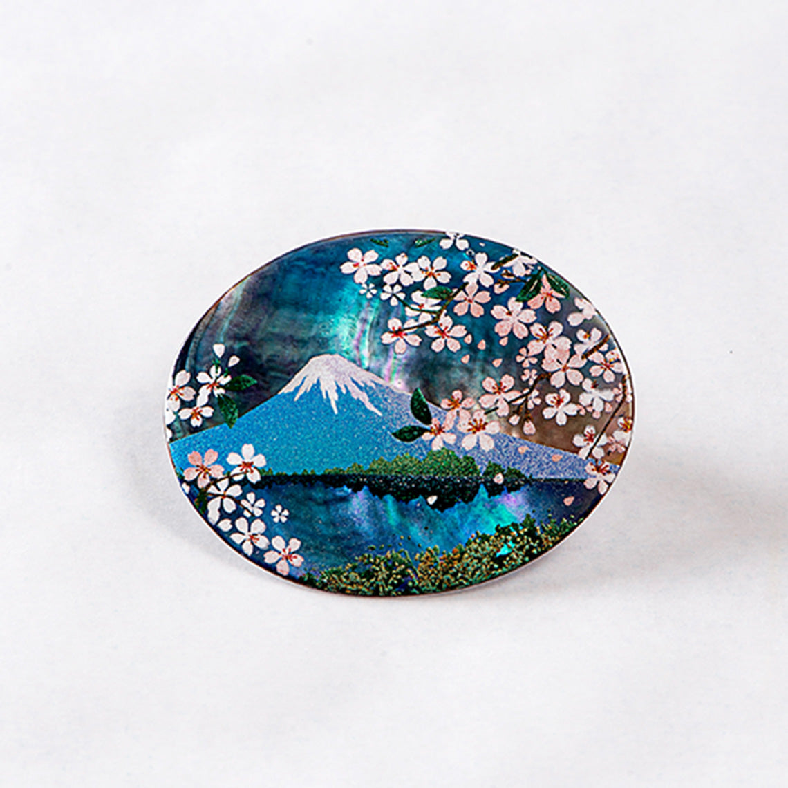 Snow-capped Mount Fuji with blooming sakura and its river reflection is captured in luminous harmony through Modern Makie. This blending of tradition and innovation creates new lacquer crafts with mother of South Sea Pearl.